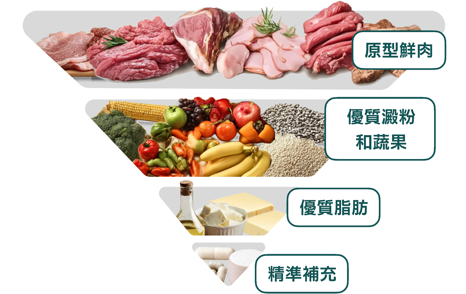 亦正因為咁,人類最新的飲食金字塔先會強調「Eat Real Food」。越接近原型、越少加工、來源越清晰,越有利於長期實踐同身體吸收。放落狗狗身上同樣成立:當我們揀食物不再只睇「標示達標」,而係邁向「更接近真食物、較少加工的形式」的理念。
